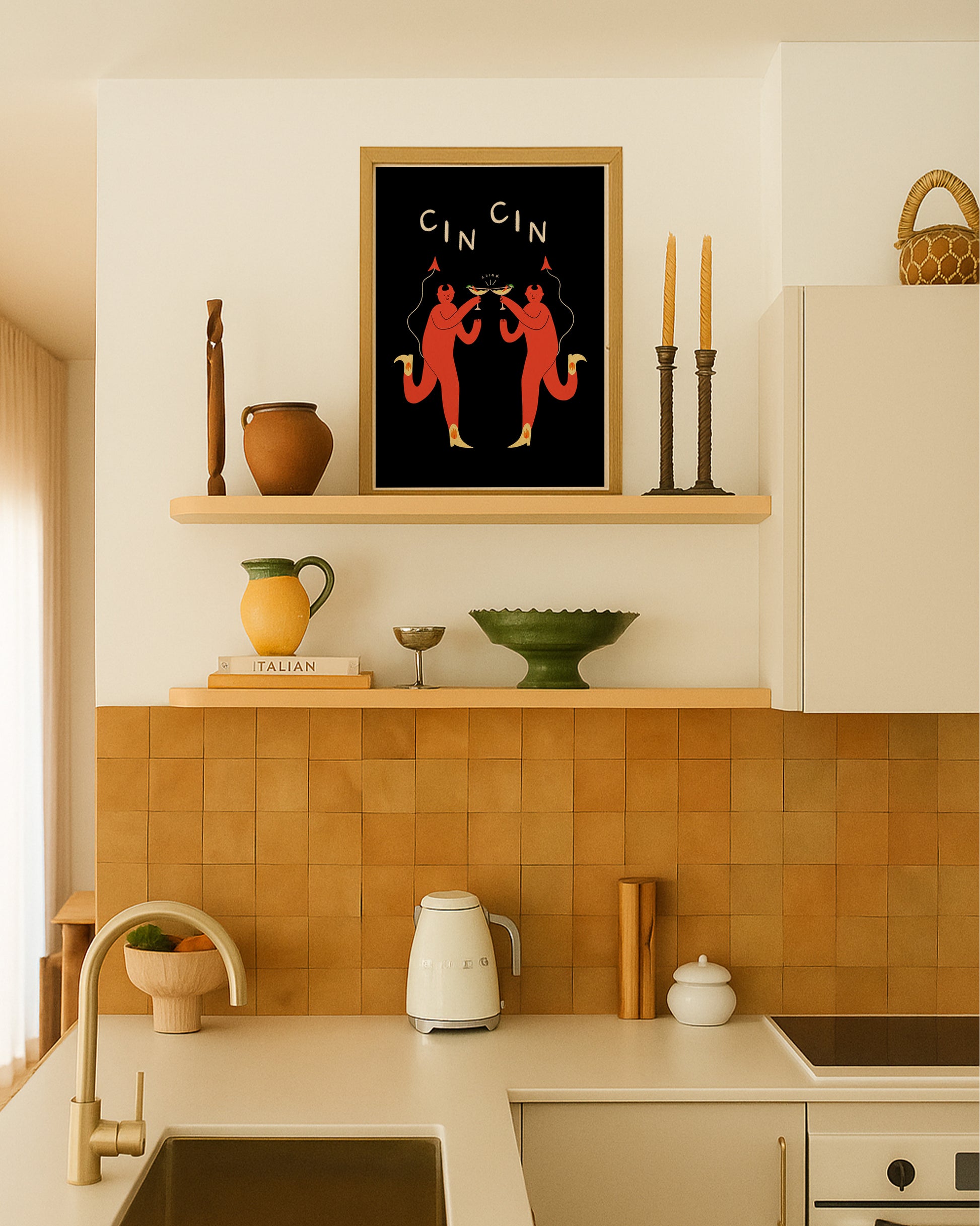 A joyful contemporary art print of two cheeky devils in cowboy boots toasting some spicy margs! Bold text reads 'Cin Cin'. A fun print that is a perfect splash of colour in a trendy kitchen or dining room.
